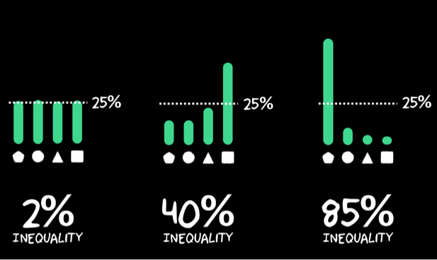 To measure the inequality of a place, we use a city-wide normalized measure. Because income groups correspond to exactly 25% of the users in the area, a totally equal place would be visited by each income group 25% of the time. This corresponds to a flat chart, like the one on the left. We consider any deviation from that flat profile to contribute to inequality. For example, a totally segregated place would show a chart more like the one on the right, with 100% of the users coming from a single income group. Mathematically, we calculate the absolute deviation of a place's income distribution from that flat ideal:
